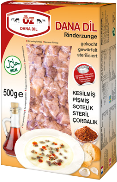 Die Rinderzunge ist schon küchenfertig zubereitet und klein geschnitten verpackt. So kann in nur wenigen Minuten ein köstliches Gericht zubereitet werden. Zum Beispiel als Suppe zubereitet ist sie eine echte Delikatesse.