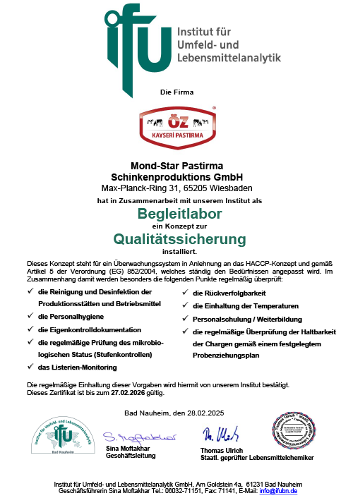 Nach der Überprüfung sorgt eine strenge Kontrolle dafür, dass die Richtlinien eingehalten werden, um eine gleichbleibende Qualität und Sicherheit für den Verbraucher zu gewährleisten. Die Mond-Star-Pastirma Schinkenproduktions GmbH ist stolz darauf, für ihre ÖZ-Kayseri-Produkte mehrere Jahre in Folge DLG-Auszeichnungen erhalten zu haben. Dies macht das Unternehmen zu einem der wenigen, die nach deutschen Qualitätsstandards original türkische Spezialitäten produzieren.