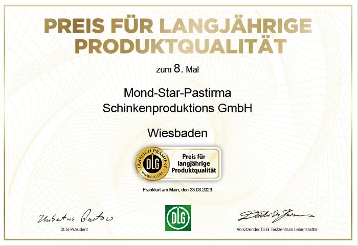 (DLG). Die Mond-Star-Pastirma Schinkenproduktions GmbH aus Wiesbaden ist von der DLG (Deutsche Landwirtschafts-Gesellschaft) zum 8. Mal mit dem ,,Preis für langjährige Produktqualität“ geehrt worden. Das Unternehmen erhält die Auszeichnung für die Qualität seiner Produkte, die im Rahmen der DLG Qualitätsprüfungen für Schinken und Wurst regelmäßig untersucht werden.