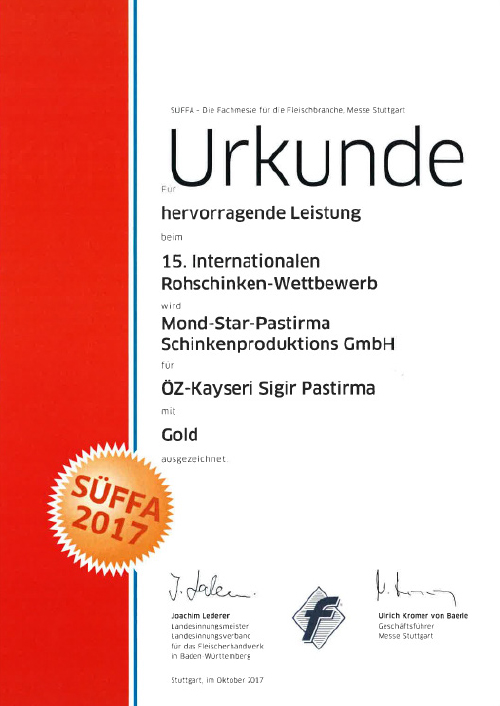 Die Süffa ist die bedeutendste Branchen- Messe der Fleischindustrie und zieht jedes Jahr zahlreiche Unternehmen aus der Branche an. Im Jahr 2017 konnte die Mond-Star-Pastirma Schinkenproduktions GmbH mit hervorragenden Leistungen, hoher Produktqualität und gutem Geschmack überzeugen und erhielt eine Goldauszeichnung im internationalen Rohschinken- Wettbewerb.